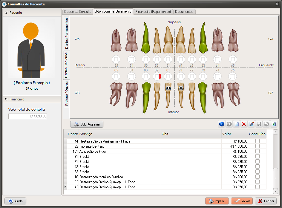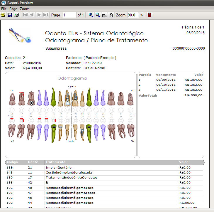Relatórios de Contas a Pagar, Contas a Receber, Recibos, Odontograma, Serviços, Consultas de Pacientes, Pacientes, Aniversariantes e Etiquetas de Endereçamento.