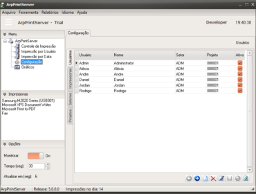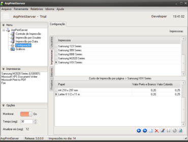 O ArpPrintServer captura e cadastra automaticamente a impressão realizada pelo usuário, assim como o usuário e a impressora (caso a mesma ainda não tenha sido cadastrada). Portanto as únicas configurações a serem realizadas no sistema é a definição dos formatos de papel que cada impressora trabalha, assim como cor e custo por página impressa, e também a alocação dos usuários aos setores e projetos.