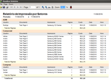 Relatórios de Impressão por Período, Setores (Centro de Custo) , Usuários, Impressora e Projetos.