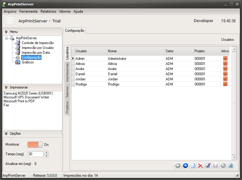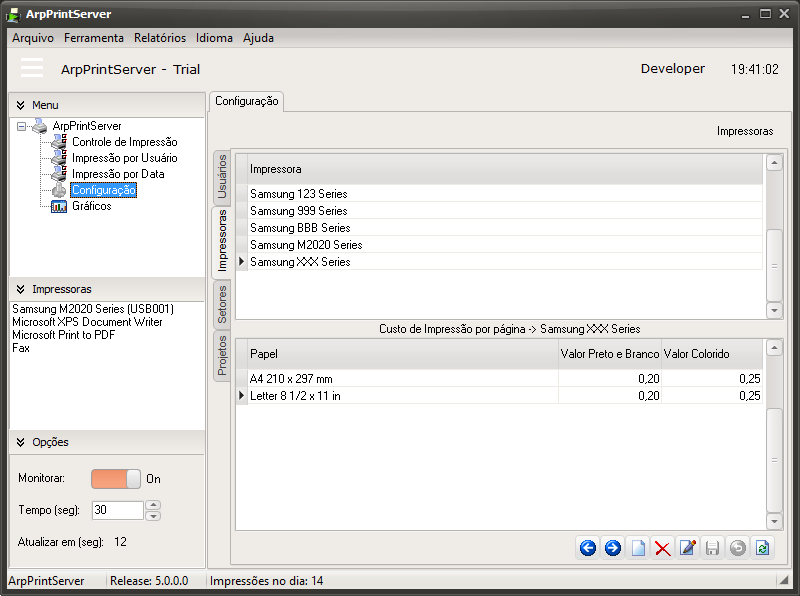 O ArpPrintServer captura e cadastra automaticamente a impressão realizada pelo usuário, assim como o usuário e a impressora (caso a mesma ainda não tenha sido cadastrada). Portanto as únicas configurações a serem realizadas no sistema é a definição dos formatos de papel que cada impressora trabalha, assim como cor e custo por página impressa, e também a alocação dos usuários aos setores e projetos.