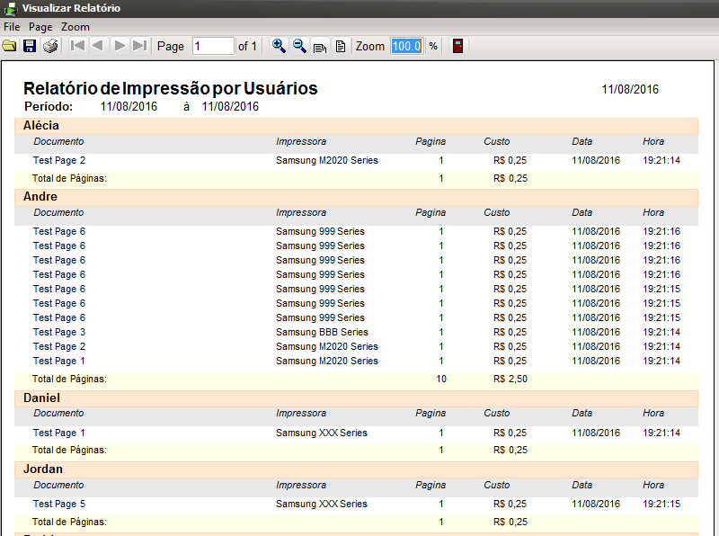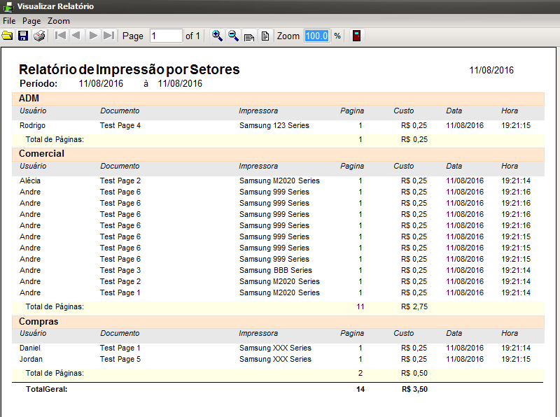Relatórios de Impressão por Período, Setores (Centro de Custo) , Usuários, Impressora e Projetos.